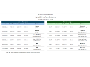 Spring 2026 Player Evals UPDATED Schedule (Sun, JAN 18)